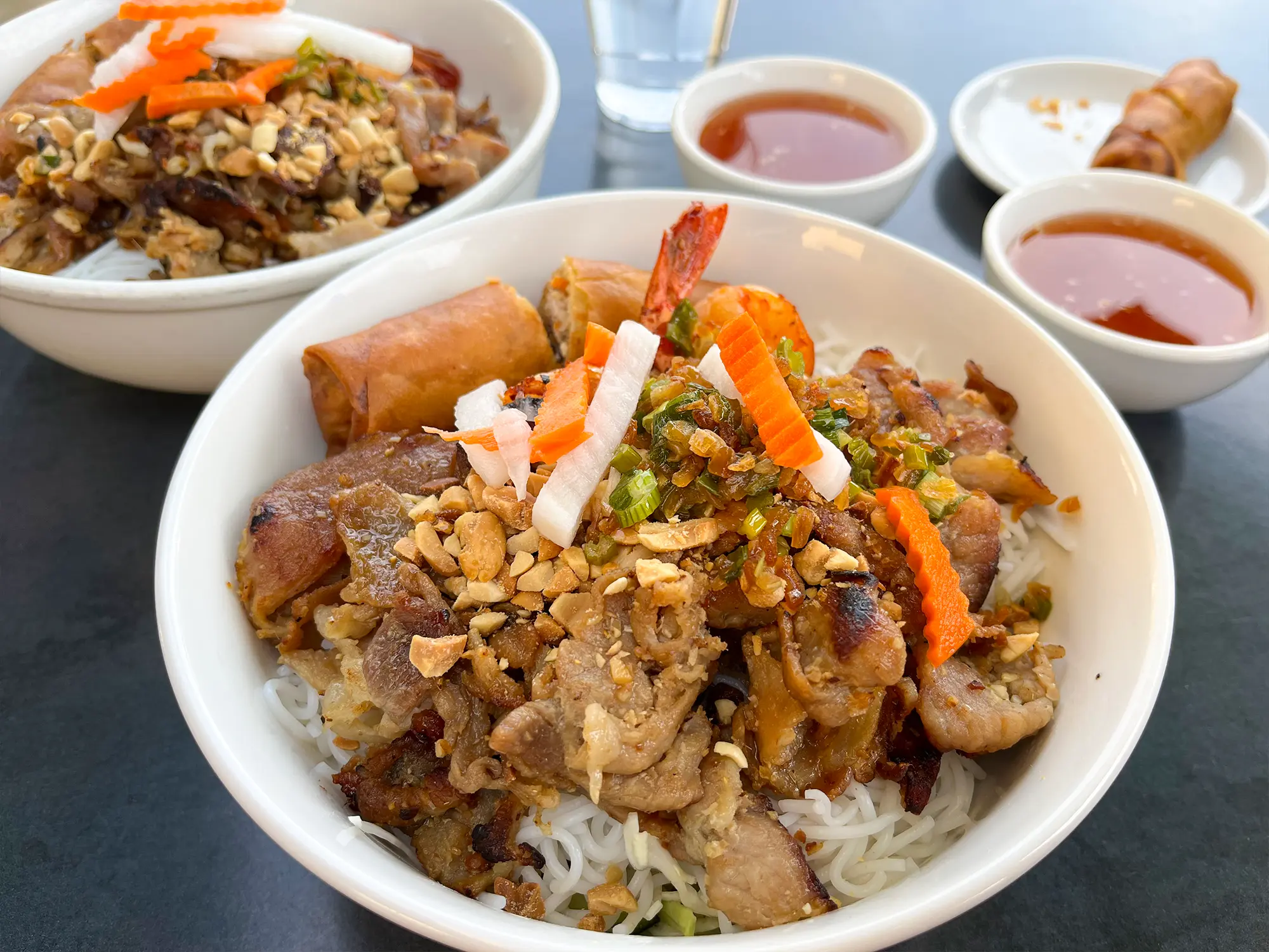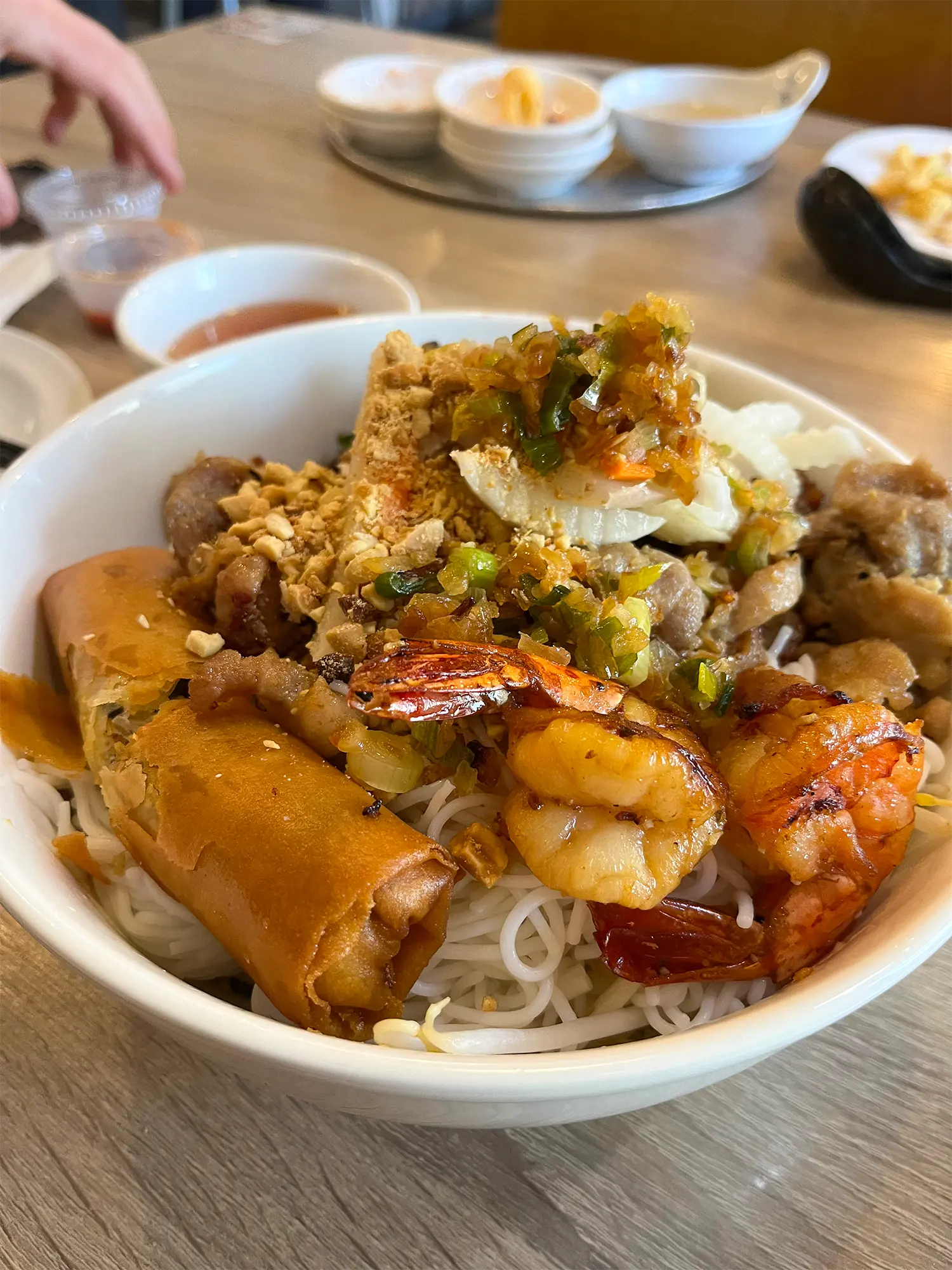 たくさんの千切りキャベツ、きゅうり、もやし、ミントやバジルの上に米粉麺。その上に炭火焼きのレモングラスなどでマリネされた豚肉とエビ、そしてピーナッツと揚げたネギ、そして大根と人参のピクルスが乗っています。これにまた特製ソースがついてくる。バンベオ達とはまた違うソースで、赤唐辛子が入ってます。