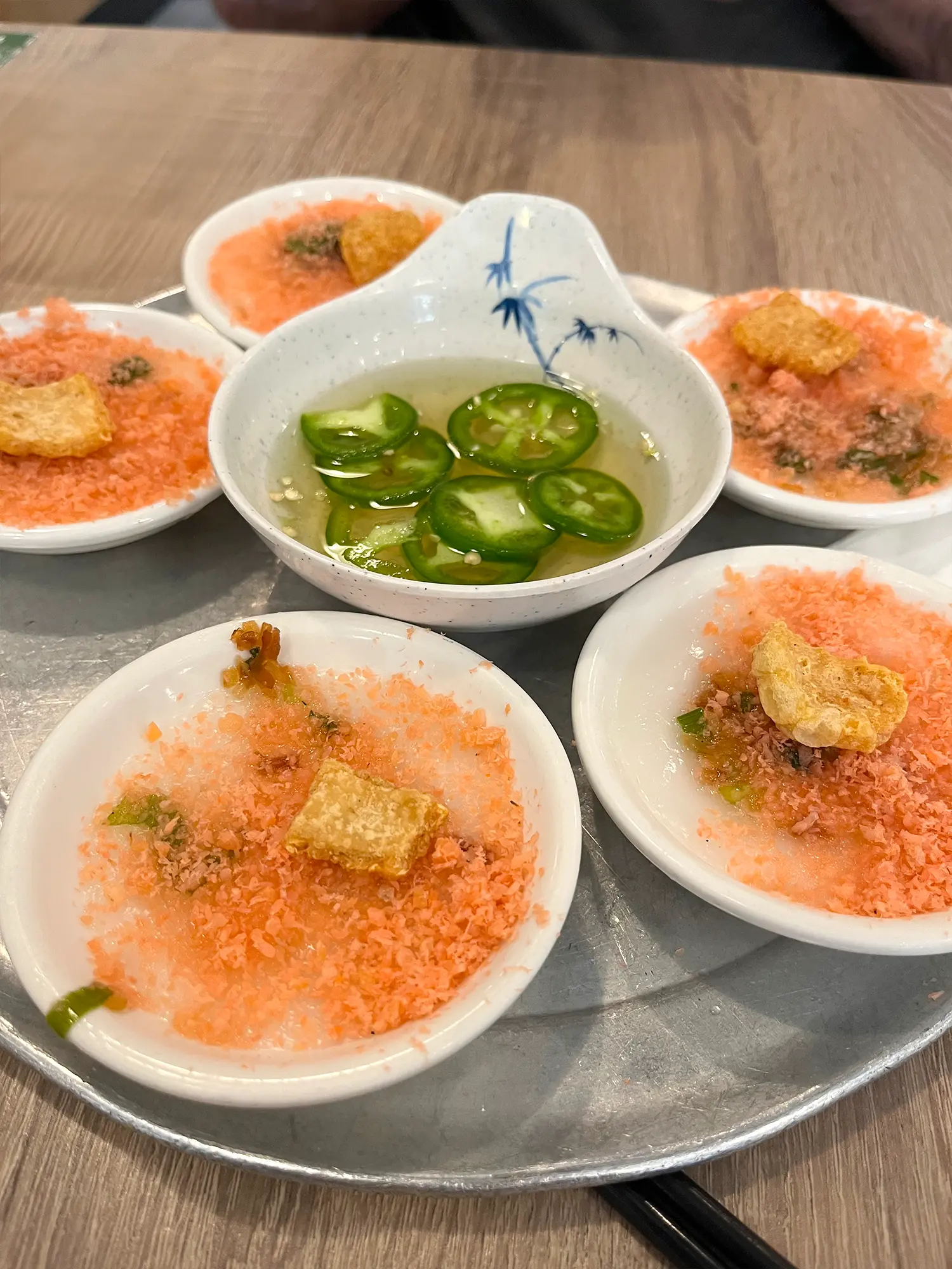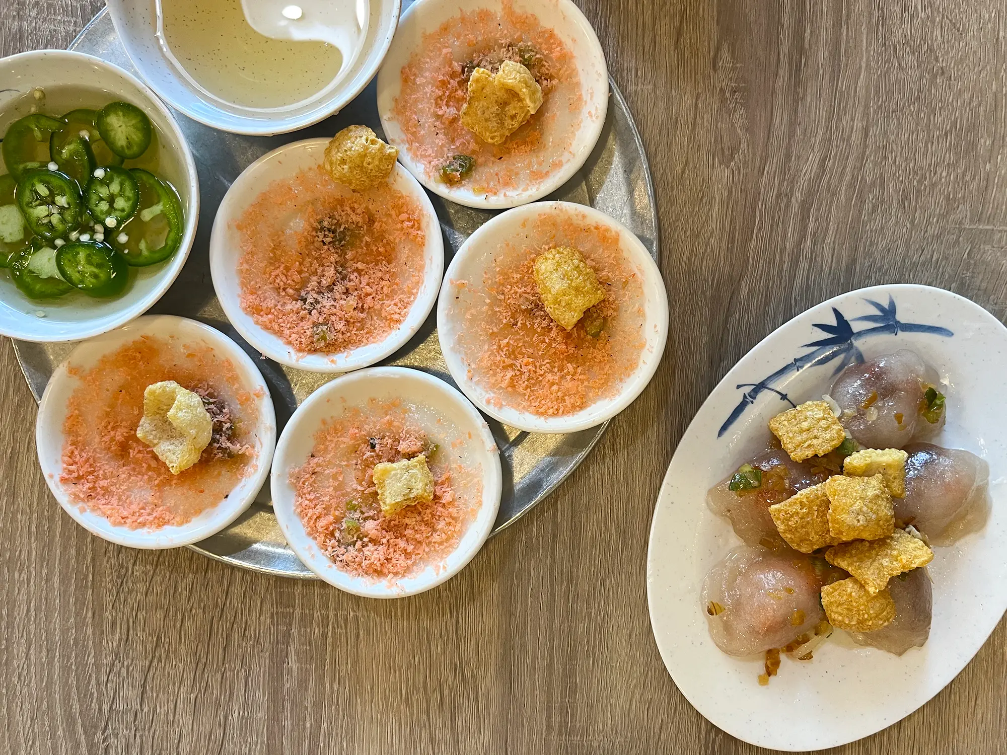 バンベオは小さな皿に盛られた蒸し餃子?で、もちもちの米粉の生地上に乾燥エビ、カリカリの豚皮、ネギなどがトッピングされています。これに特製のタレ(ナンプラー、水、砂糖、ライム、唐辛子)をかけて食べると、もちもちカリカリで、エビの旨みとニンニクやら何やらブワッと旨みに溺れます。